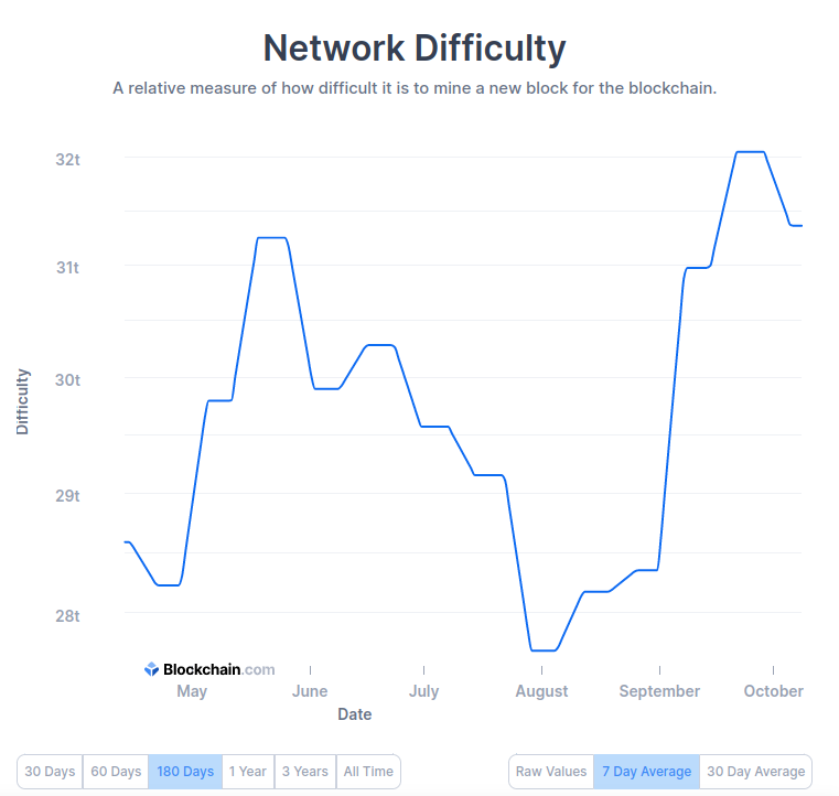 2008년 처음 등장한 비트코인의 Difficulty는 계속 증가하여 현재 31T(31조) 까지 증가하였습니다. 세부적으로 보면 난이도는 블록이 생성되는 시점에 따라 증감하는 것을 확인할 수 있습니다.