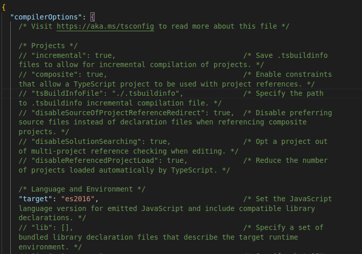tsconfig.json 파일이 생성되었고, 안에 보시면 엄청 많은 내용이 들어있습니다. 모든 내용을 다 사용하는 건 아니지만 각 옵션이 어떤 역할을 하는지 알아보시면 좋습니다.