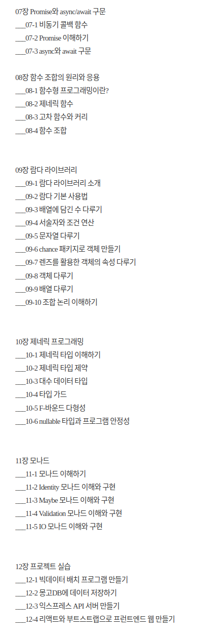 8장 부터 나오는 함수형 프로그래밍, 제네릭, 람다 라이브러리, 모나드는 처음 접하는 분들에게는 어려울 수 있습니다. 아니 어렵습니다. JS나 TS가 고차 함수를 지원하고 함수형 프로그래밍을 구현하는데 최적화 되어 있기는 하지만 그럼에도 실제 코드에서 사용하기에는 어려운 개념입니다.