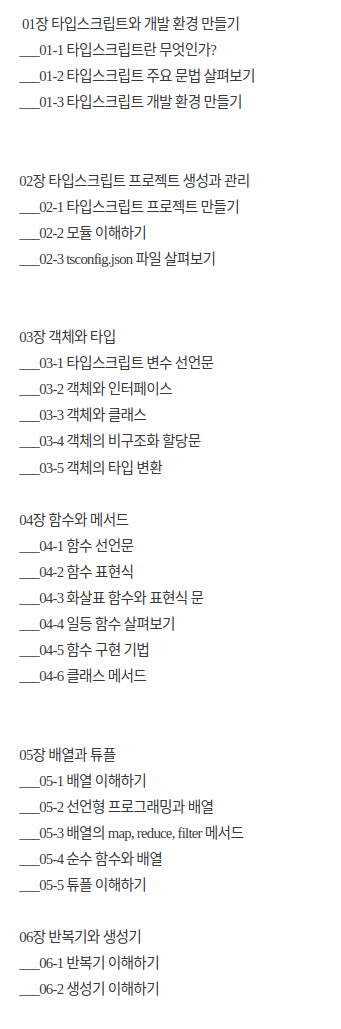 일단 첫장을 펴니 목차가 등장합니다. Do it 타입스크립트 프로그래밍은 기본 Javascript 문법에서 시작해 함수형 프로그래밍을 심도있게 다루고 마지막에는 배치 프로그램과 Express,React를 활용한 API 웹 서비스를 구현해볼 수 있습니다.