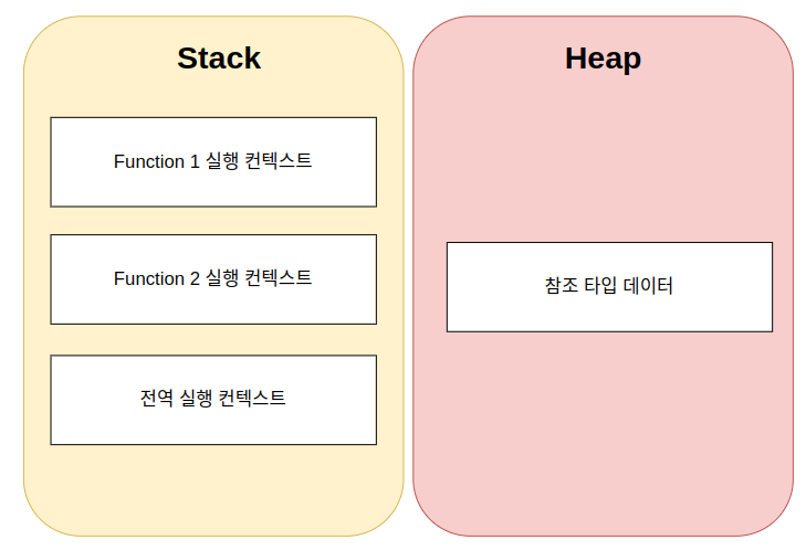 Javascript에서 메모리는 스택 메모리와 힙 메모리로 구분된다. 스택 메모리는 단순 변수들에 사용되며, 힙 메모리는 복잡한 객체에 사용된다.
