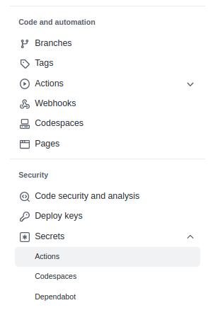 왼쪽 하단의 Secrets -> Actions을 선택합니다.