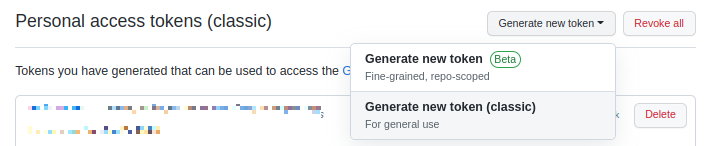 우측 상단에 Generate new token을 클릭하고 Generate new token(classics)를 선택합니다.