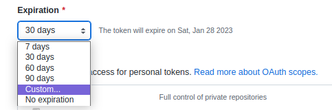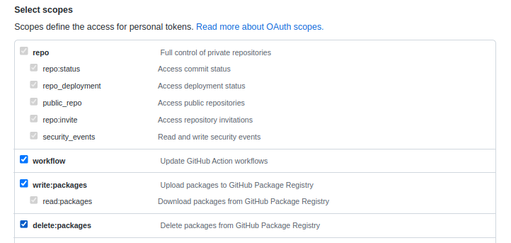 token의 권한을 지정합니다. CI/CD를 구성하기 위해서는 최소 아래 3개의 권한이 필요합니다.