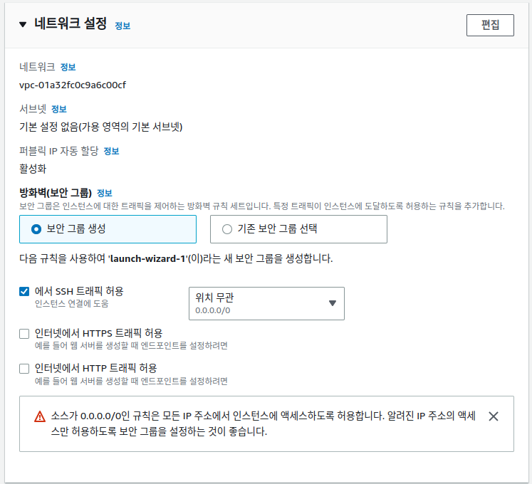 다음으로 보안그룹을 설정해줍니다. 우측 상단에 편집을 클릭합니다.