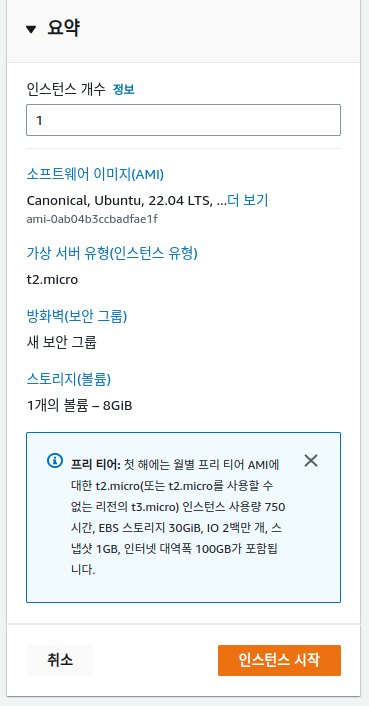 설정이 완료되면 인스턴스 시작을 클릭해 서버를 생성합니다.