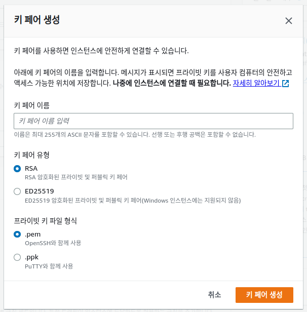 키 페어 이름을 지정하고 RSA 형식의 키페어를 생성합니다.