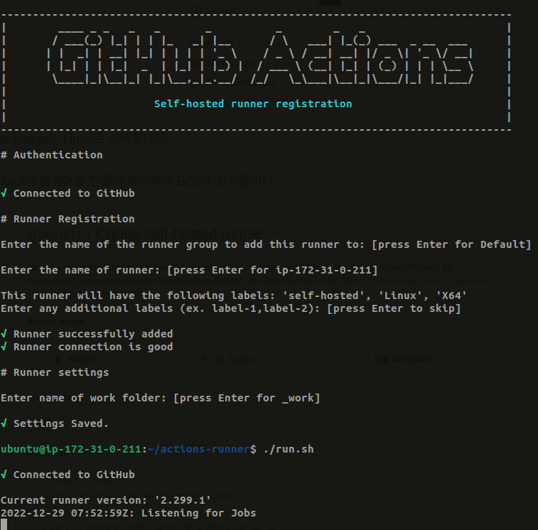 마지막 run.sh 스크립트 파일을 실행하면 Github Actions job을 기다리고 있습니다.