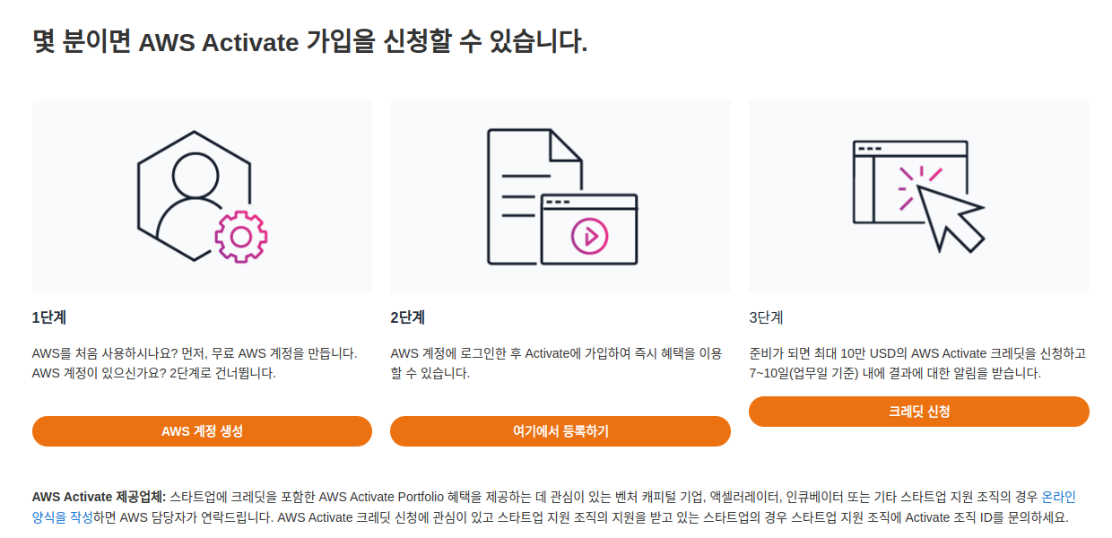 창업을 준비하고 있다면, 그 중에서도 온라인 창업을 준비하고 있다면 서버와 프론트를 배포할 서버가 있어야 합니다. 가장 많이 사용하는 IaaS고 AWS에서 초기 창업자라면 크레딧을 수령할 수 있습니다. AWS Activate Program에 참여하시면 됩니다. 총 $10,000 상당의 크레딧을 제공하고 있습니다.