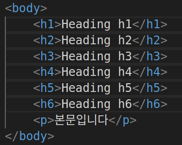 글자는 h1~h6 까지 각자 크기가 다른 태그를 사용할 수 있습니다. 본문을 적기 위해서는 p 태그를 사용합니다.