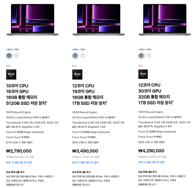 애플 공홈에 들어가보면 M2 탑재 14인치, 16인치 맥북프로 제품이 진열되어 있습니다. 기본사향인 10코어 CPU, 16코어 GPU 탑재모델이 2,790,000원 부터 시작합니다. (환율 떨어진게 언젠데 아직도 높은 책정가인가요)