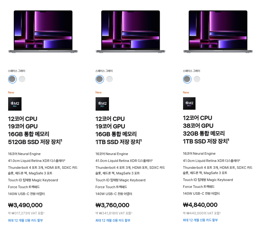 16인치 M2 맥북프로도 기본형 12코어 CPU, 19코어 GPU가 3,490,000원 부터 시작합니다. 고급형인 12코어 CPU, 38코어 GPU는 4,840,000원 부터 시작합니다.