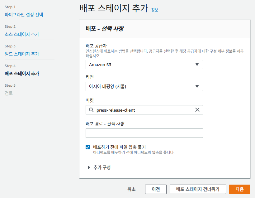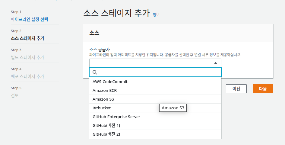 배포 공급자를 Amazon S3로 선택합니다. 기존의 생성했던 버킷을 선택합니다.