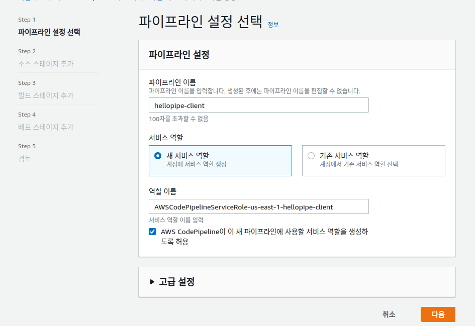 새로운 파이프라인 이름을 지정해주고 다음을 클릭합니다.