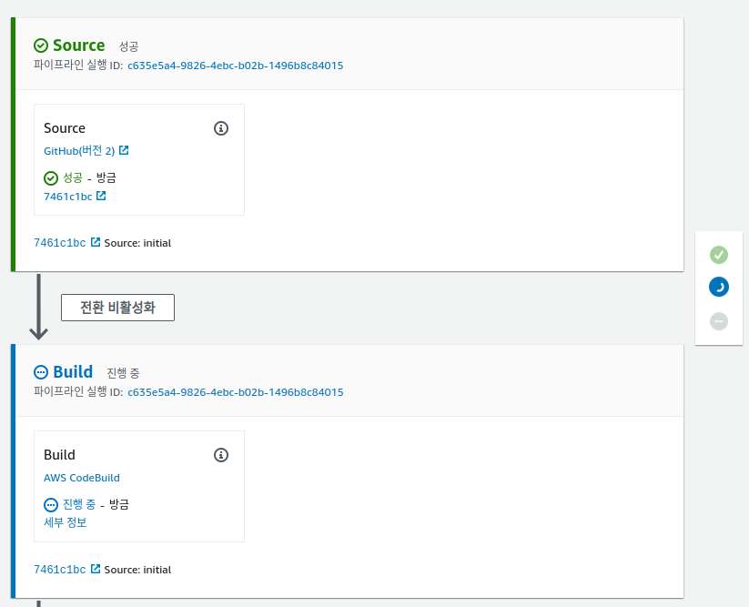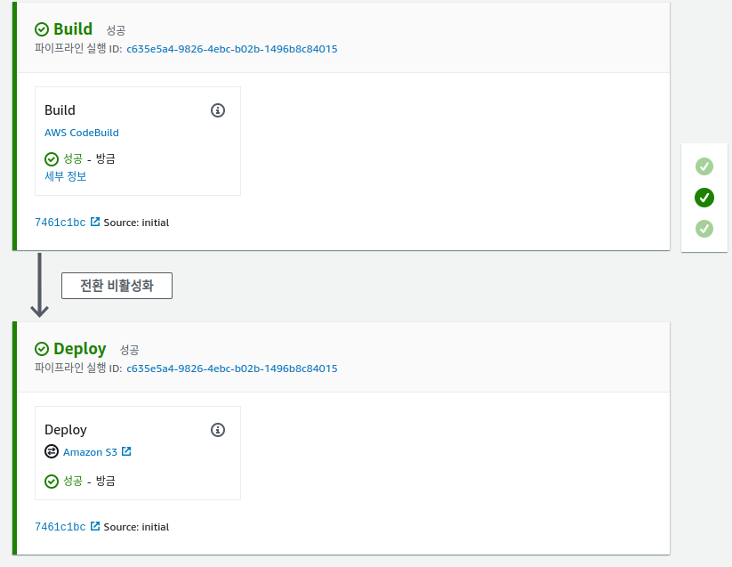 Source -> Build -> Deploy 과정이 모두 정상적으로 처리되면 초록색으로 탭과 오른쪽 버튼이 변경됩니다.