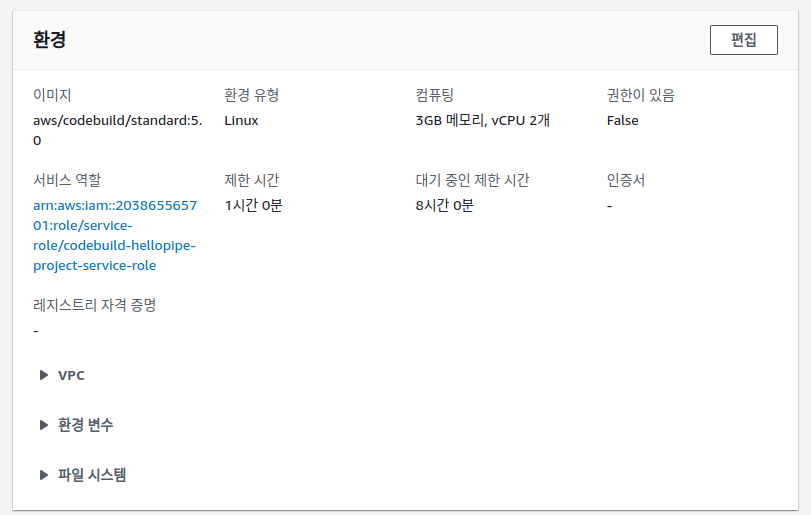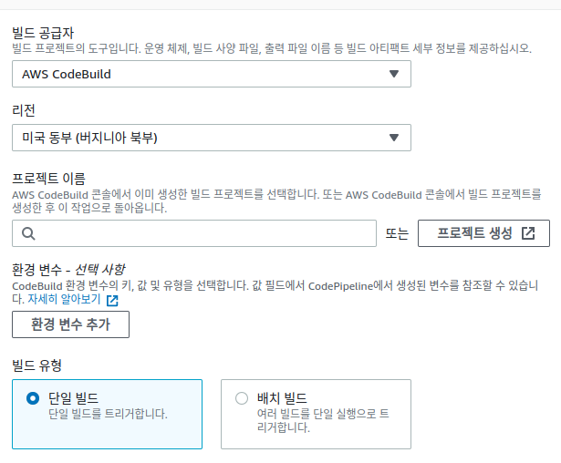 - 빌드 작업 공급자 : AWS CodeBuild