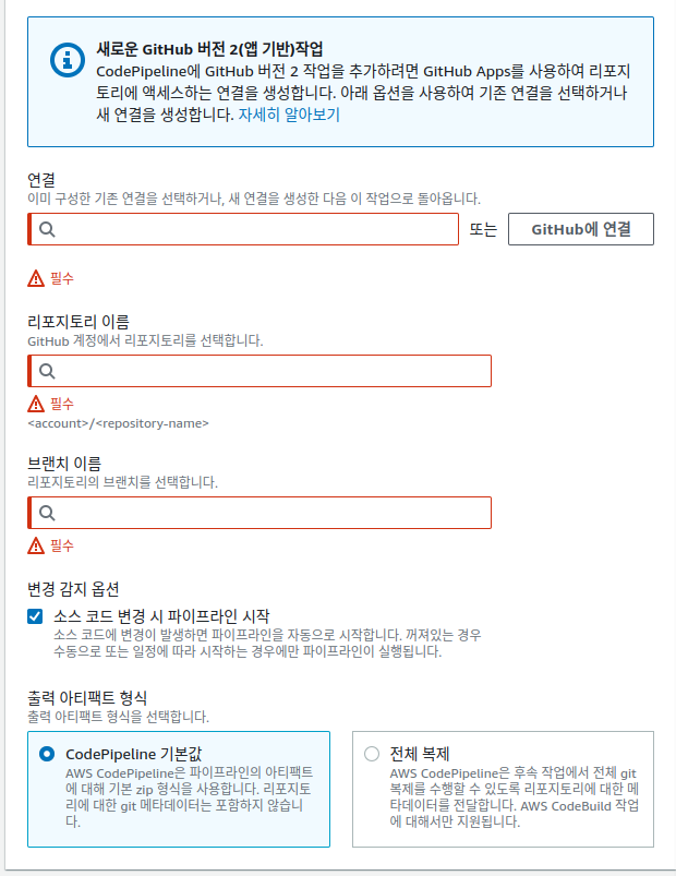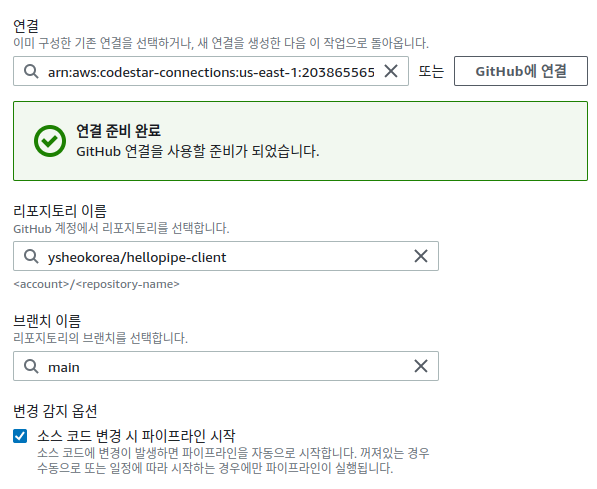 - 우리가 코드를 push 하면 CodePipeline이 작동하면서 Gihub에서 코드를 가져옵니다.