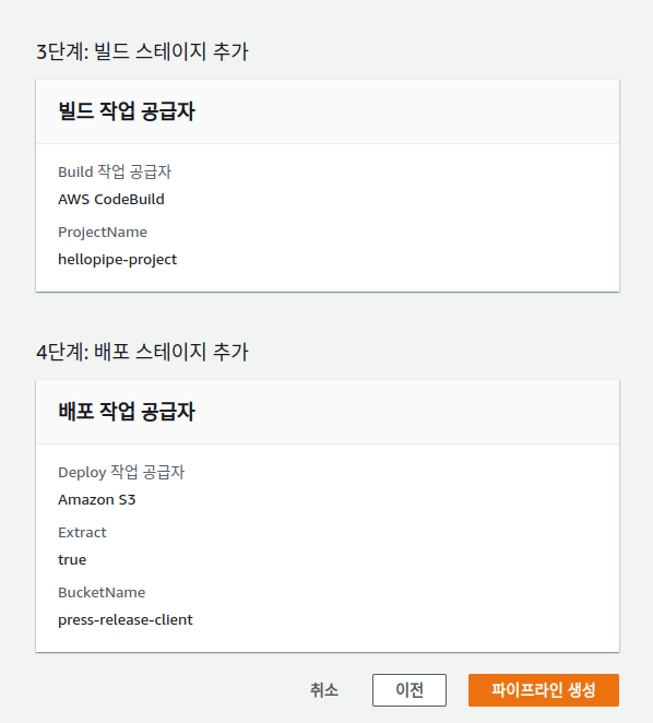 구성 내용이 모두 맞다면 파이프라인 생성을 클릭합니다.