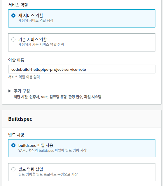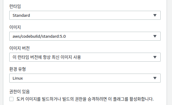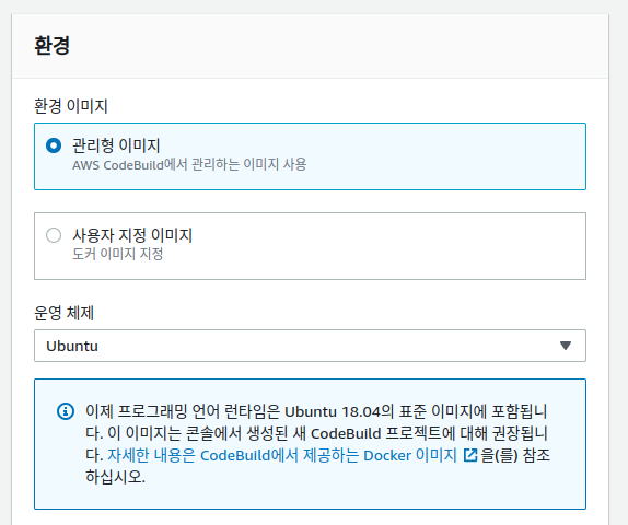 환경 이미지는AWS CodeBuild에서 사용하는 이미지 사용 / 운영체제는 Ubuntu를 선택합니다.(도커로 컨테이너화 관리를 하고 싶다면 사용자 지정 이미지로 선택하시면 됩니다.)