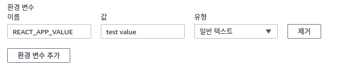 추가 구성 페이지에서 환경변수를 설정해줍니다. 저는 환경변수 이름을 REACT_APP_VALUE로 지정했고, 값으로는 test value를 지정했습니다.