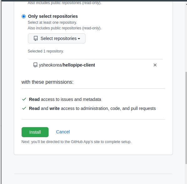 Only select repositories를 선택해서 hello pipeline client가 담긴 레포를 선택합니다.