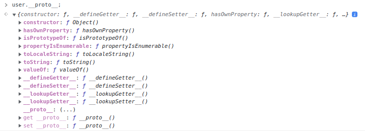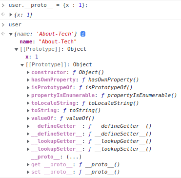 객체에 __proto__ 접근자 프로퍼티를 사용해서 [[set]] 함수를 호출하고, [[Prototype]] 내부 슬롯에 새로운 값을 할당한다. user 프로퍼티 하위에 [[Property]] 내부슬롯에 새로운 프로퍼티가 설정된 것을 확인할 수 있다.