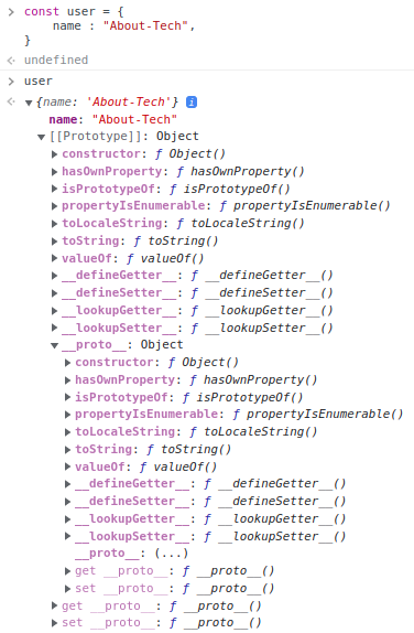 Chrome에서 객체를 생성한다. 객체 프로퍼티를 자세히 살펴보면 [[Prototype]]을 가지고 있고, 그 안에 "__proto__" 접근자 프로퍼티를 가지고 있다. [[Prototype]] 내부슬롯과 동일한 프로퍼티를 가지고 있는 것을 확인할 수 있다.