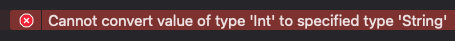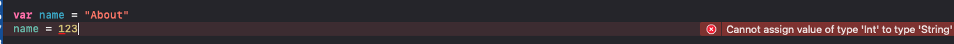 name 변수에 문자열이 아닌 Bool이나 Int 형 숫자 값을 할당하게 되면 아래와 같은 에러를 반환하게 됩니다.