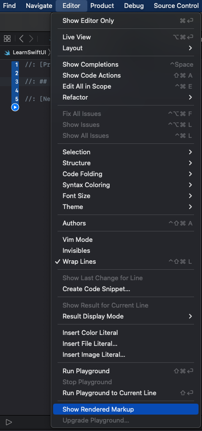 주석을 단 후에는 [Editor] -> [Show Rendered Markup]을 선택하시면 마크업 언어 형태로 플레이그라운드를 볼 수 있습니다.