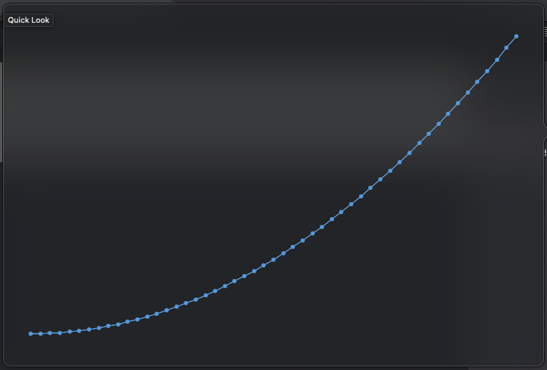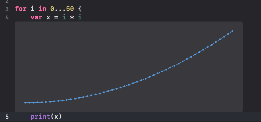 위 코드를 실행하면 50번의 루프를 순회하면서 x 변수값을 출력합니다. 오른쪽 미리 보기 결과물을 보시면 Quick Look 버튼이 있는데요, 눈모양 아이콘을 클릭하시면 변수의 변경 추이를 확인할 수 있습니다.