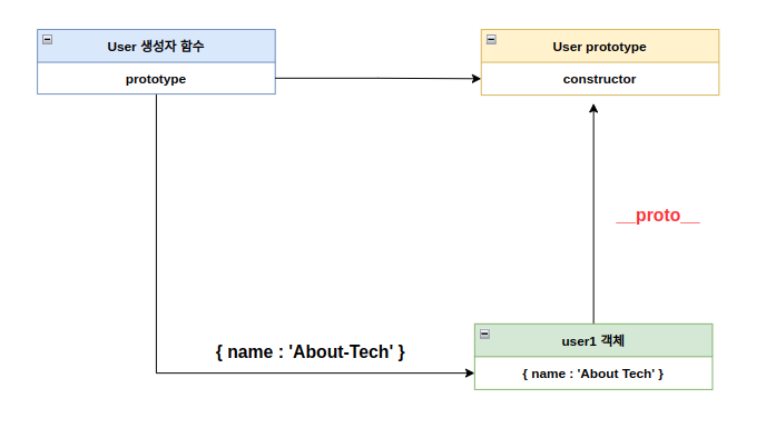 user1 객체는 constructor 프로퍼티를 소유하고 있지 않지만 user1 객체의 프로토타입 User.prototype에는 constructor 프로퍼티를 소유하고 있다. user1 객체는 __proto__ 접근자 프로퍼티를 사용해 constructor을 상속받아 사용할 수 있게 된다. 최종적으로 객체에는 constructor 함수의 결과물인 name : 'About-Tech' 가 할당된다.