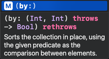 오름차순으로 정렬하기 위해서는 다음과 같이 sort() 함수를 사용합니다. sort 함수는 매개변수 by를 가지는데요 Bool 타입의 반환 타입을 함수로 받고 있습니다.