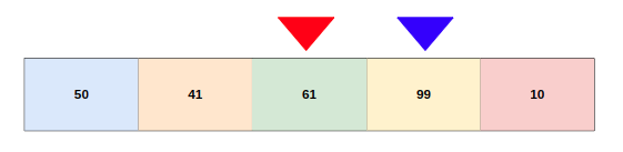 버블 정렬은 가장 첫번째 요소 부터 비교를 시작한다. 첫 요소인 50과 두번째 요소 61을 비교한다. 오름차순으로 정렬한다고 했을 때 두 수의 스왑은 일어나지 않는다.